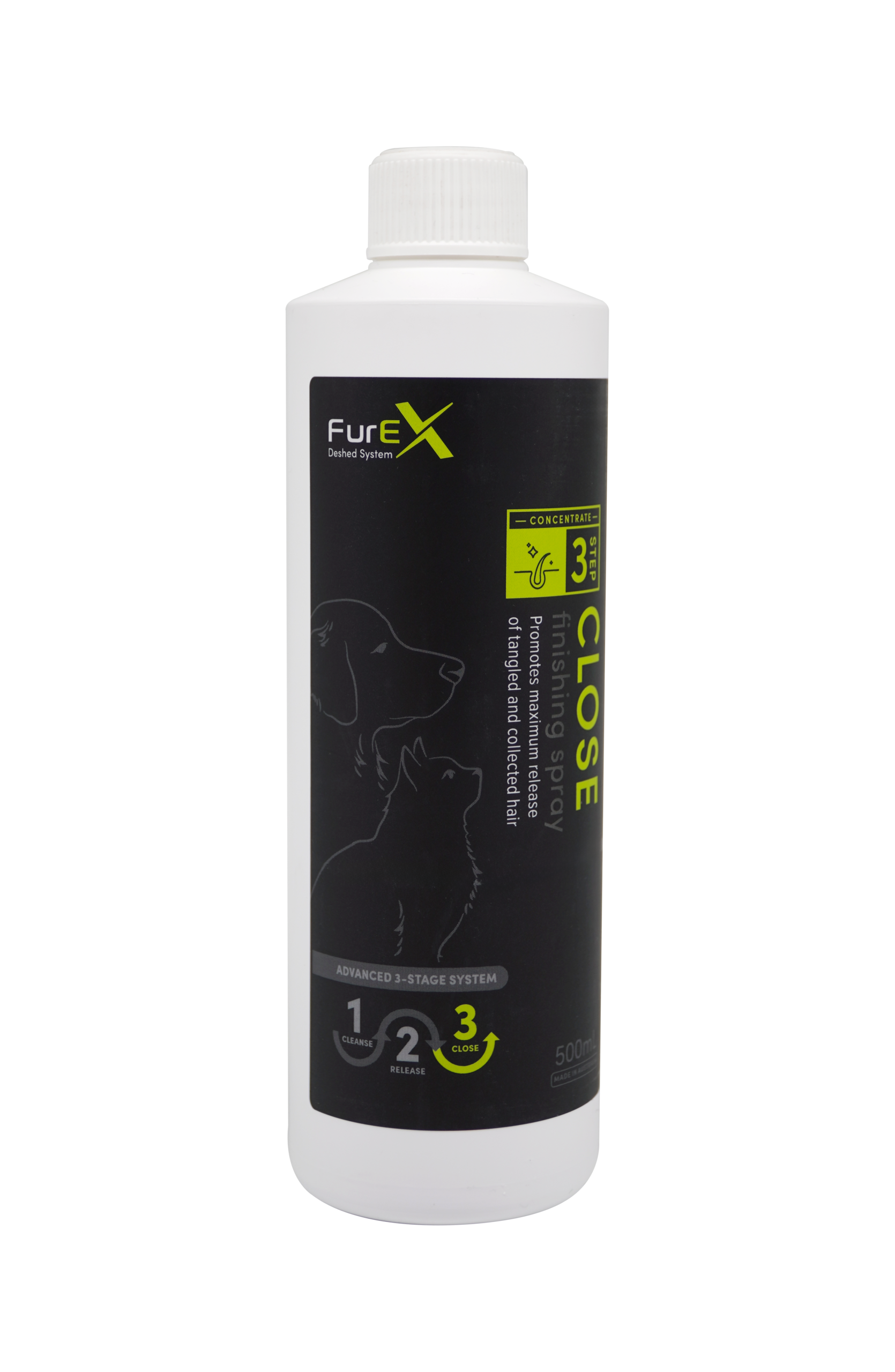 FurEx Close Finishing Spray Step 3 is a mildly acidic, leave-in conditioning formula that will further seal the hair cuticle and promote maximum release of tangled and collected hair within the coat.